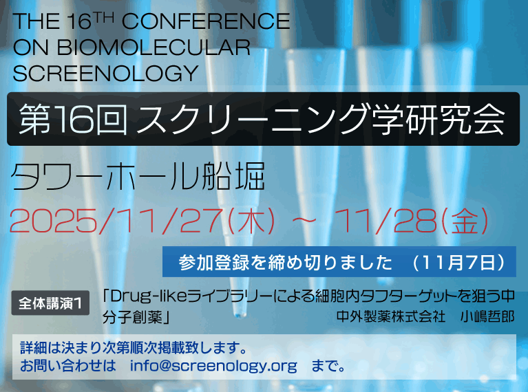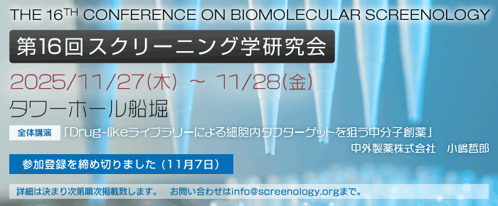 氏名、所属、連絡先(E-mailアドレス)を明記の上、下記までお申込みください。 スクリーニング学研究会事務局 櫻井 健吾(kengo.sakurai◎gr.tsubakimoto.co.jp)◎をアットマークに替えてください。 |